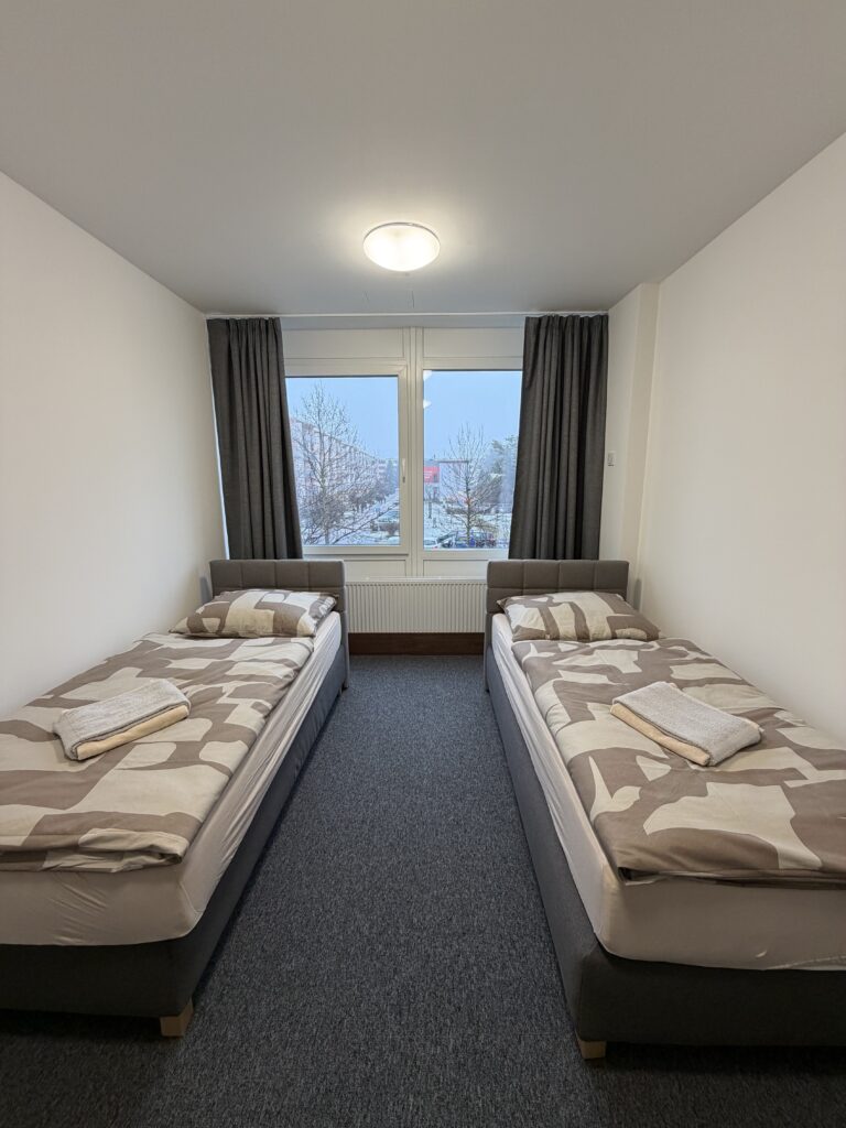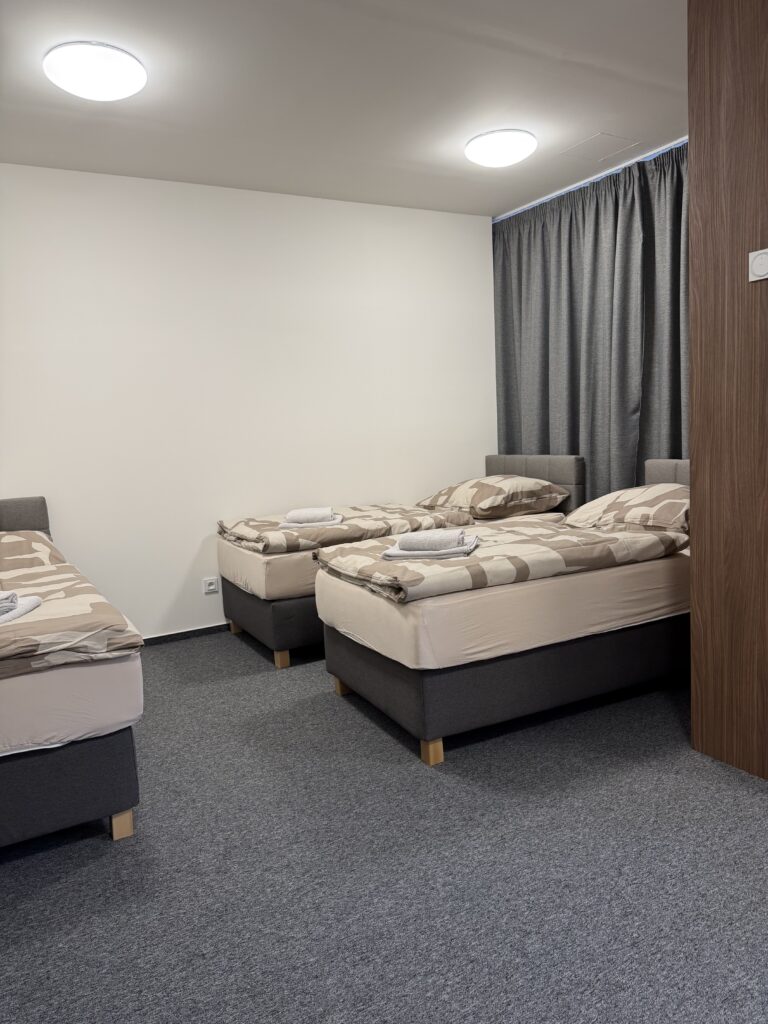 Při delším pobytu je důležité nejen praktické zázemí, ale i pohodlí. Pokoje jsou vybaveny kvalitními vysokými matracemi, blackout závěsy, venkovními žaluziemi a televizí. Součástí pobytu je také běžný denní úklid.
